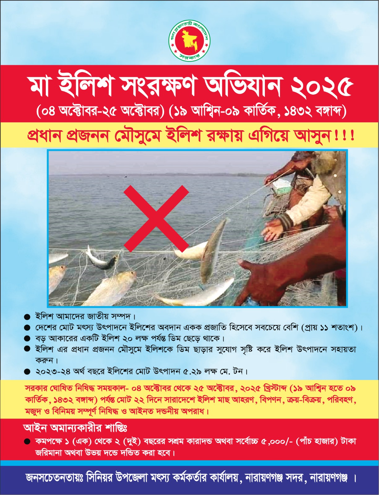 ০৪ অক্টোবর থেকে ২৫ অক্টোবর ইলিশের প্রধান প্রজনন মৌসুমে মোট ২২ দিন (০৪ অক্টোবর থেকে ২৫ অক্টোবর) ইলিশ মাছ আহরণ, পরিবহণ, মজুদ, বাজারজাতকরণ, ক্রয়-বিক্রয় ও বিনিময় সম্পূর্ণ বন্ধ থাকবে।